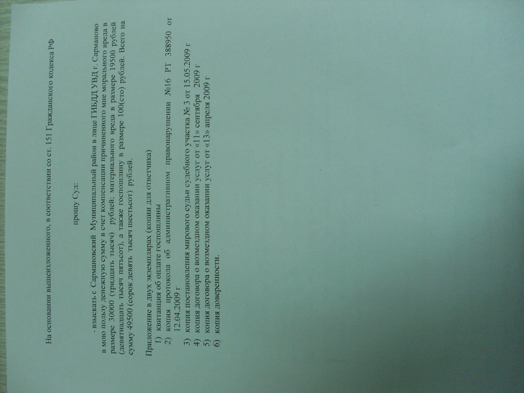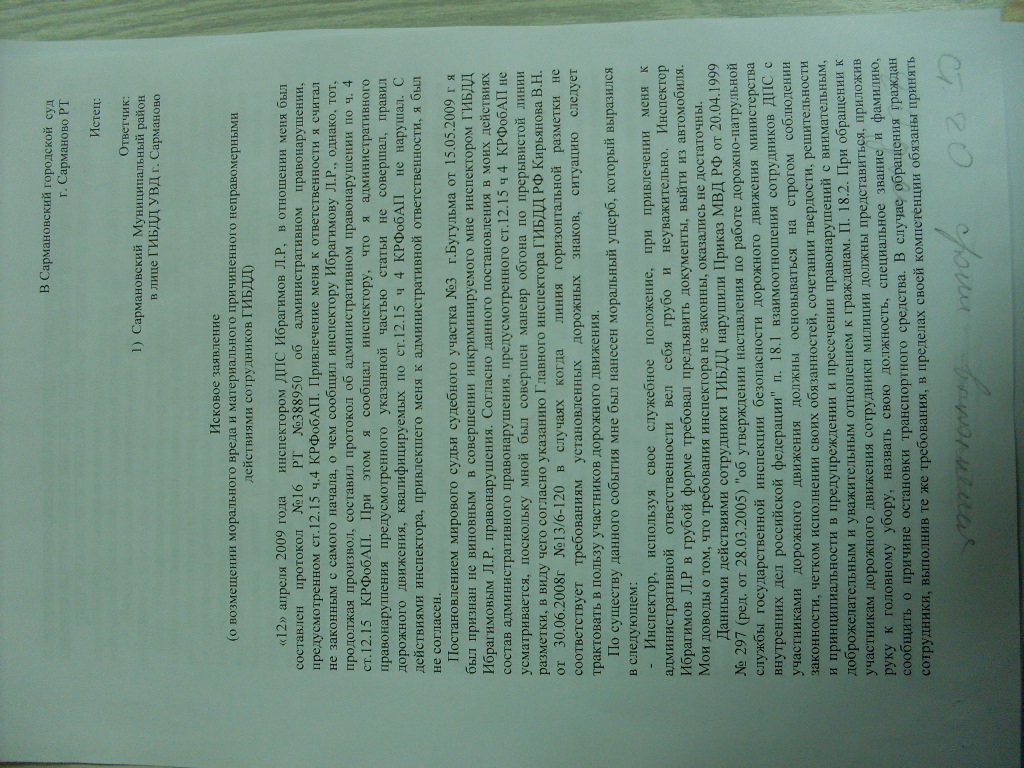 | Леха, ты бы еще вверх ногами текст выложил Чуть шею не свернул, пока читал. Иск лучше обозвать: "О взыскании материального ущерба, причиненного неправомерными действиями сотрудников ГИБДД и компенсации морального вреда". Основания материального вреда лучше втиснуть вначале, морального - после. А так, в принципе, нормально.