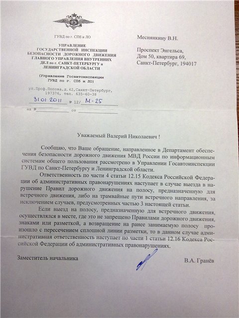 Ваша честь, в Вашем производстве находится административное дело, возбужденное в отношении меня 13.08.2011 по ст. 12.15 КоАП инспектором ОГИБДД г.о. Химки, ст. лейтенантом полиции Зелепукиным М.И. При рассмотрении дела прошу принять во внимание следующие обстоятельства: В протоколе об административном правонарушении 50 АК №784920 от 13.08.2011 г., составленном инспектором ОГИБДД г.о. Химки, ст. лейтенантом полиции Зелепукиным М.И., инспектор вменил ответственность по части 4 статьи 12.15. Кодекса Российской Федерации об административных правонарушениях (КоАП РФ), квалифицировав ситуацию как «Совершила выезд на сторону дороги, предназначенной для встречного движения, в нарушение п.п. 9.1 ПДД, требования дорожной разметки 1.1 ПДД…». Часть 4 статьи 12.15. КоАП РФ гласит: «Выезд в нарушение Правил дорожного движения на сторону дороги, предназначенную для встречного движения, за исключением случаев, предусмотренных частью 4 настоящей статьи, - влечет лишение права управления транспортными средствами на срок от четырех до шести месяцев.» В моем письменном Объяснении обстоятельств административного правонарушения по протоколу 50 АК № 784920 изложены подробности данного происшествия. Я начала обгон там, где он разрешен, а закончить его смогла лишь с пересечением сплошной линии разметки. Завершить обгон иначе у меня возможности не было. Согласно Правил, разметку 1.1 пересекать запрещается для ВЫЕЗДА на сторону дороги предназначенной для встречного движения. Однако, я совершала ВЫЕЗД на полосу встречного движения для выполнения обгона, через разметку 1.6, которая разрешает совершать обгон транспортных средств. При этом, разметка 1.6 не сопровождается дорожным знаком 3.20 «Обгон запрещен». Через разметку 1.1 я осуществляла ЗАЕЗД, что не запрещается Правилами. Возвращение на ранее занимаемую полосу через разметку 1.1 не образует правонарушения, попадающего под диспозицию ч.4 ст.12.15 Кодекса. Так же Разъяснениями Департамента Обеспечения Безопасности Дорожного Движения МВД РФ, данными в п. 4 Письма «О квалификации правонарушений» № 13/П-1724 от 25.07.2008г. «Водитель транспортного средства, начавший выполнение обгона через разметку 1.5 или 1.6, при приближении к разметке 1.1 должен предпринять все возможные действия к незамедлительному возвращению в ранее занимаемую полосу (в том числе через сплошную линию разметки), что и было мной выполнено. Копия письма прилагается (Приложение 1 моих письменных Объяснений). Решениями российских судов подобные случаи (выезд на встречную полосу в разрешенном месте и возврат в свою полосу через сплошную линию 1.1) также не квалифицируются по ч.4 ст.12.15 КоАП РФ. Отмечу, что введение наказания в виде лишения права управления транспортными средствами за нарушения, предусмотренные частью 4 статьи 12.15. КоАП РФ, имело своей целью уменьшение числа столкновений автомобилей, связанных с выездом участников дорожного движения на сторону дороги, предназначенную для встречного движения. Целью же моего маневра было, напротив, скорейшее освобождение полосы движения, предназначенной для встречного движения. Прошу также суд учесть, что сотрудник ОГИБДД г.о. Химки, ст. лейтенант полиции Зелепукин М.И., являющийся должностным лицом, пренебрёг приказом МВД № 185 от 02.03.2009 «Об утверждении Административного регламента Министерства внутренних дел Российской Федераци