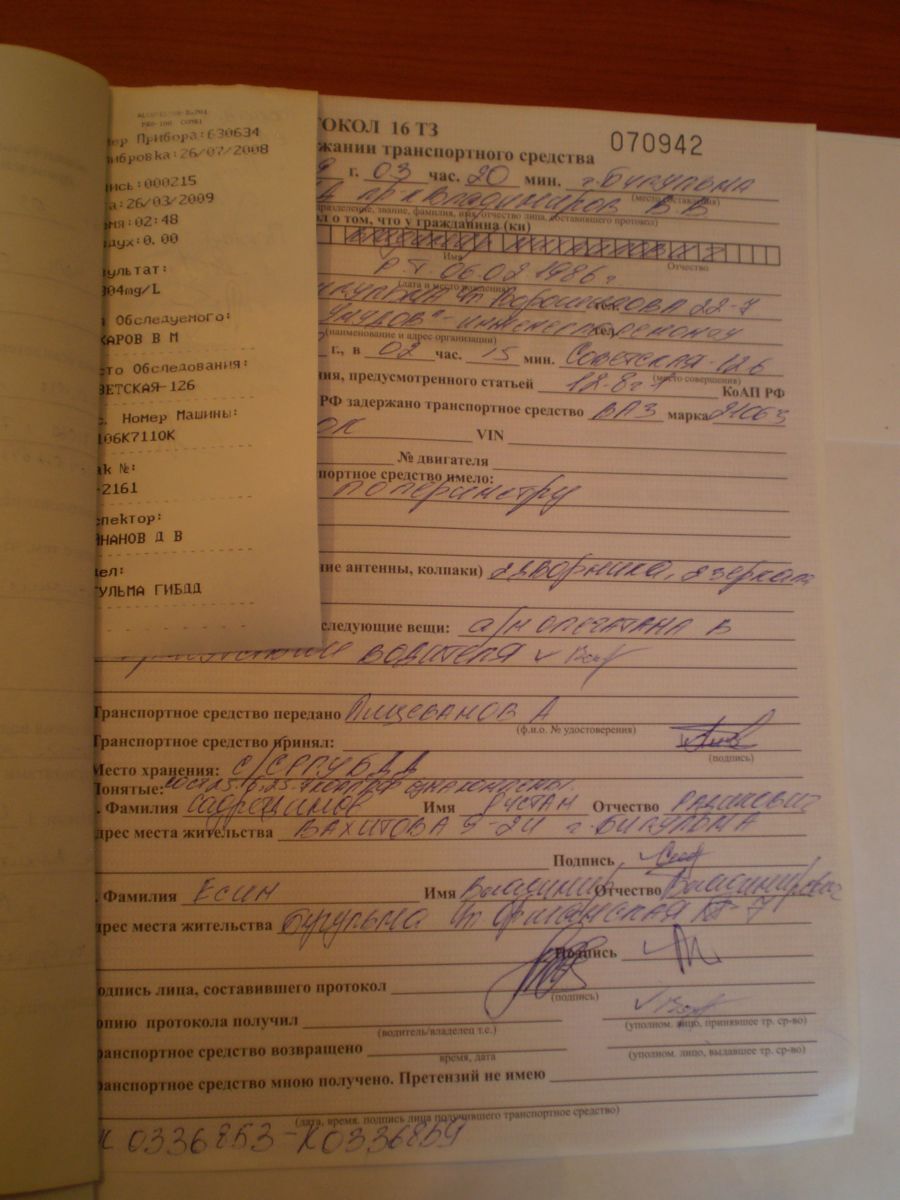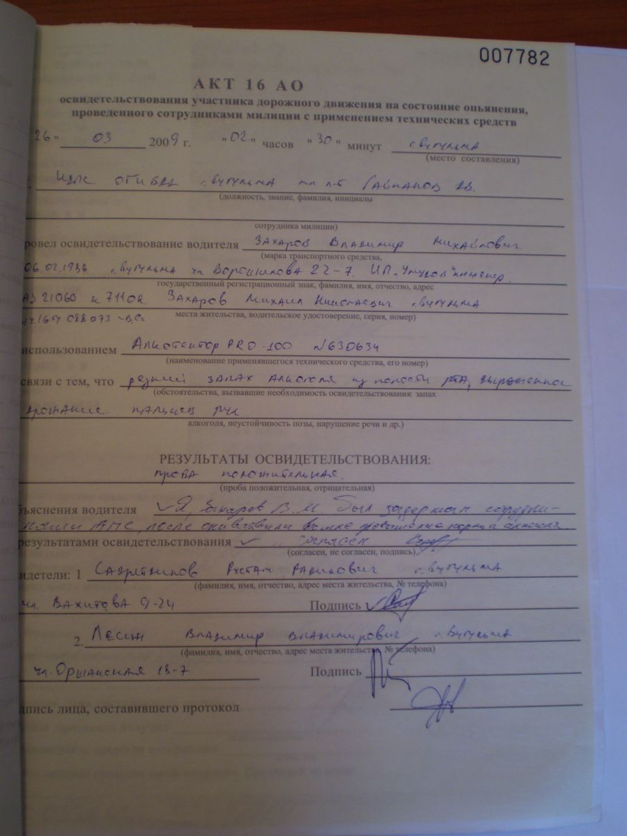 | Привет все! Ситуэшн такой . Едет лвок со своей дамой домой около 02.00, догоняет ДПС, проверяет документы и грит пройдемте от вас запах.Лвок пил около 0.5 пива , но это было около 20.00 времени.Поэтому он в недоумении. Дали один алкотесто дунуть, что то не получилось(он у них или не работал или они им пользоваться не могли).Поехали к др экипажу там и нашли второй алкотестор, который показал 0.324 мг/л.Лвок не зная своих, как обычно, прав согласился и поставил подпись " согласен". И поехал сам на мед освидед в мед учреждение- там трезв. Вопрос в том, что 1.акт освидет не соотвествует форме утверденной приказом МВД № 676 2 В акте просто указано - "результат положительный" 3. Акт составлен в 2.30 а чек из алкотестора в 2.48ч 4 калибровка последняя проводилась 26.07.08 Можно ли по таким "косякам" ходат-ть об исключениии акта освид как недопустимое доказательство?Кто знает подскажите.
