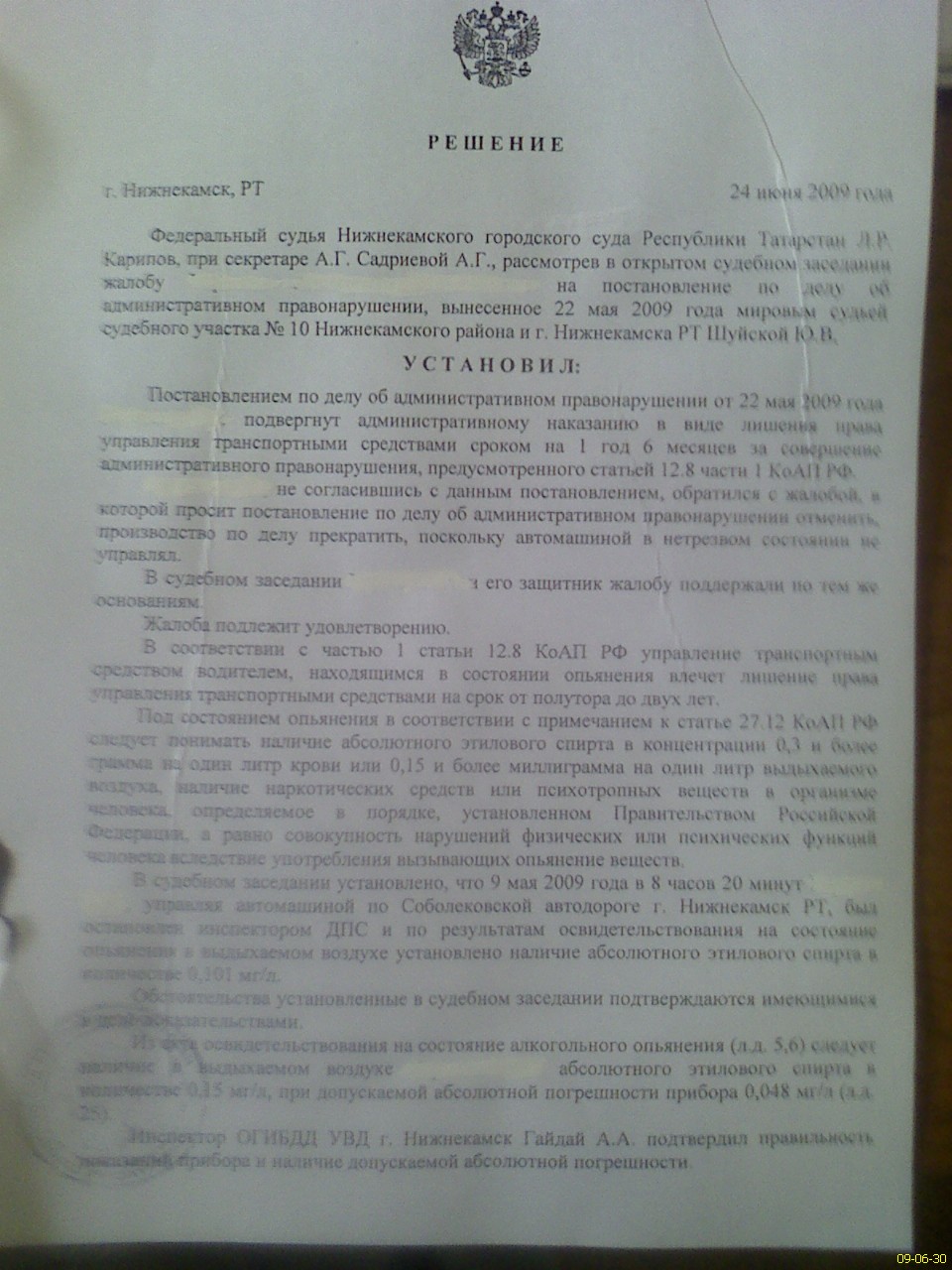 23 мая 2009 г. в 7 часов 45 минут доверитель был остановлен сотрудником ДПС на пр. Мира г. Нижнекамска. Инспектору показалось, что доверитель находится в состоянии опьянения. Не отстраняя водителя от управления ИДПСом было предложено водителю пройти освидетельствование на состояние опьянения. Освидетельствование проводилось Алкотектором ПРО 100 комби рег. № 630513. Результат освидетельствования 0.172 млг\л. Доверитель не скрывал, что выпил 22 мая бутылку пива. С результатами освидетельствования водитель согласился.