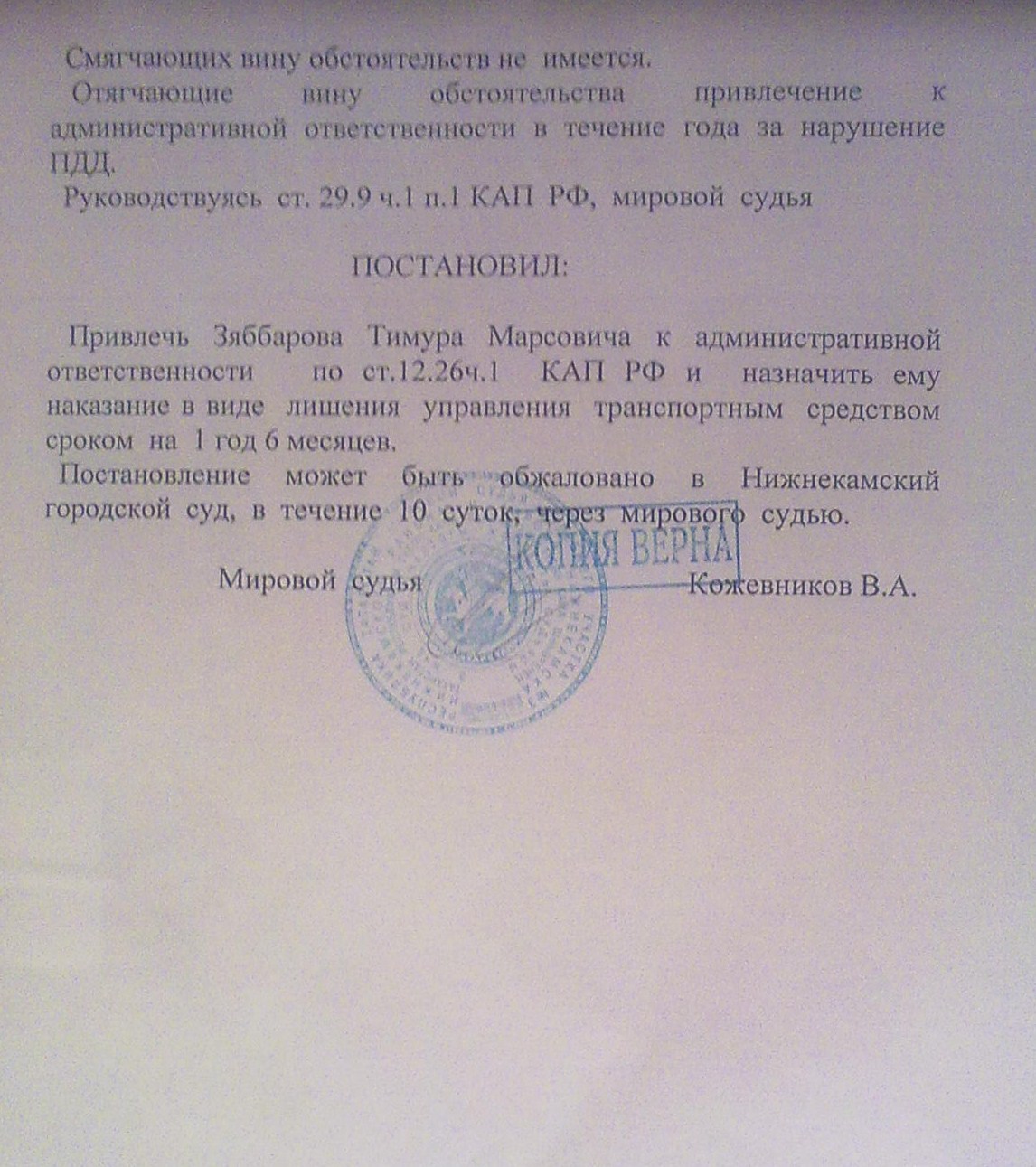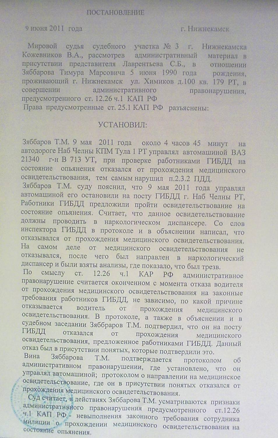| Quote (Nik_Olle) какой отказ если освидетельствование состоялось? В протоколе АПН написано 12.26.1 Отказ. ЛВОК в объяснениях написал, что отказался. В административном деле нет постановления и справки, подтверждающей, что МОСО состоялось. Эти доки мы получили в ГНД.