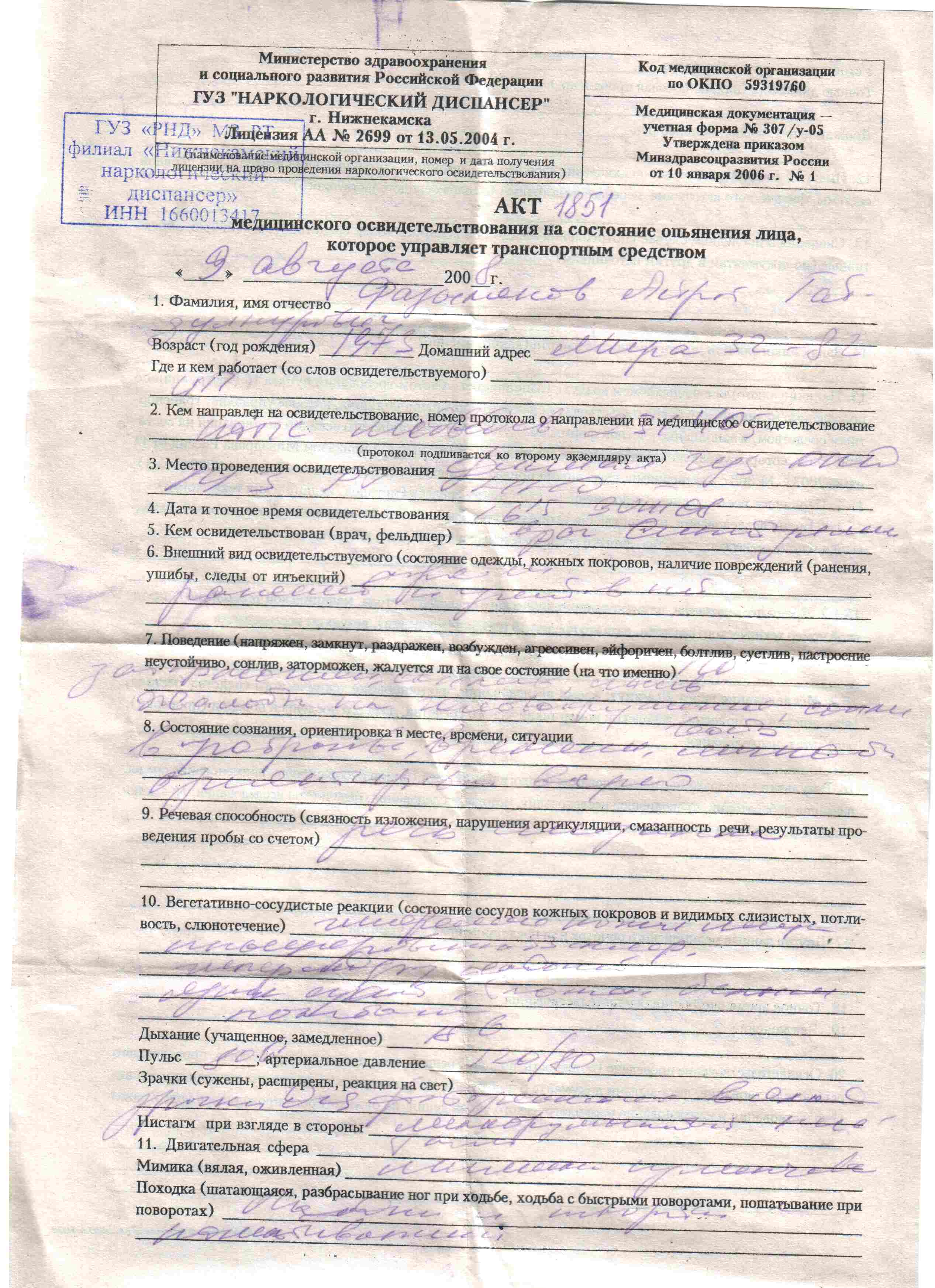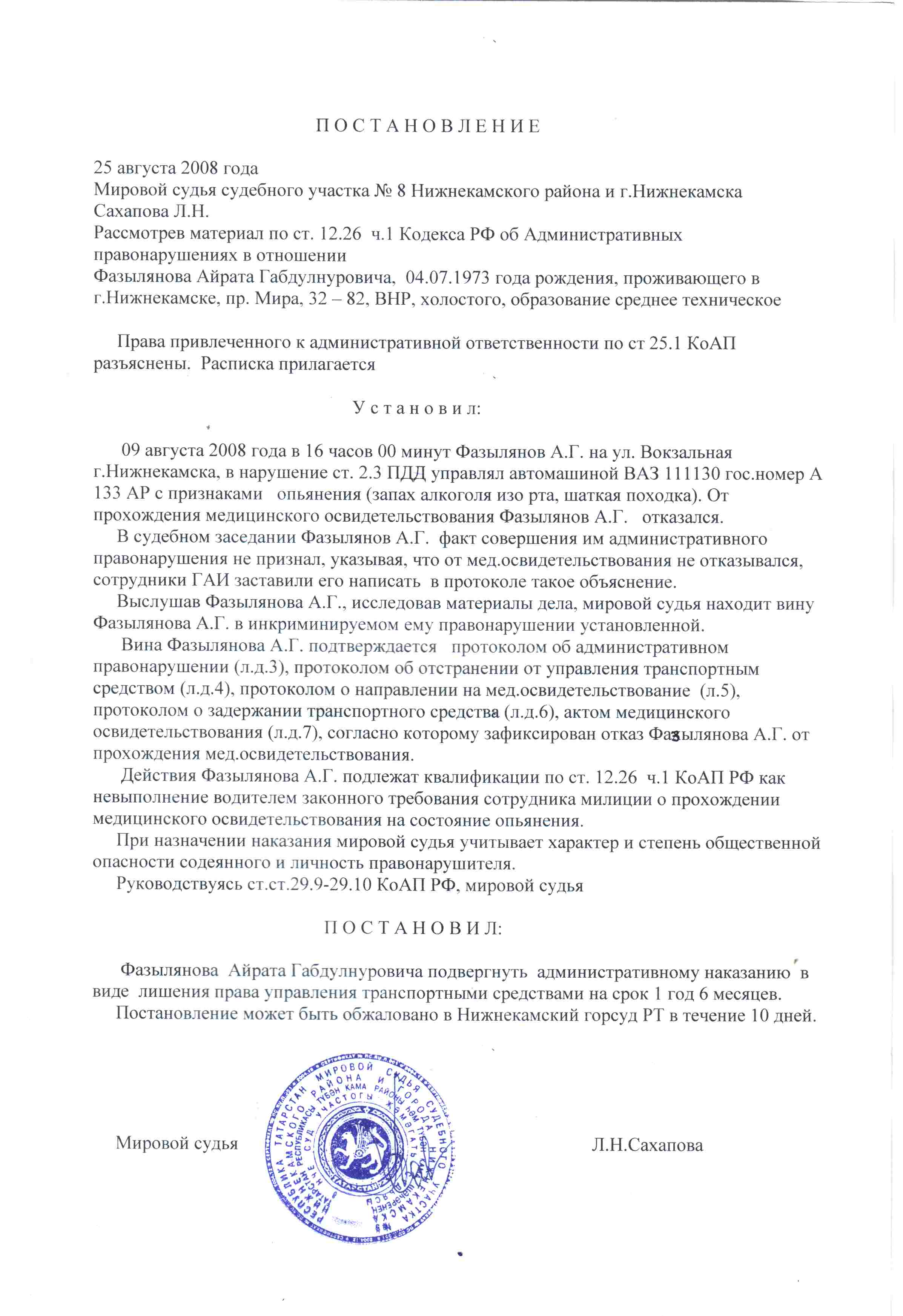 | В приклепленных файлах Акт МО и постановление МС на ЛВОКа. Обжаловали. Жалоба на постановление 25 августа 2008г. мировой судья судебного участка №8 своим постановлением подвергла меня административному наказанию в виде лишения права управления ТС сроком на 1 год 6 месяцев. 9 августа 2008г. примерно в 15 часов 30 мин. находился в своем припаркованном автомобиле возле магазина «Нур» и ждал товарища. Примерно в 16 часов к моей машине подошел инспектор ДПС и попросил предъявить документы на ТС. Проверив документы ИДПС начал меня убеждать, что я нетрезв. Я не согласился с такими выводами. Инспектор предложил проехать на медосвидетельствование. Был составлен протокол № 281405 о направлении на МО. В протоколе я написал, что согласен на прохождение МО. По прибытию в Наркологический диспансер г. Нижнекамска врач задавал вопросы о моем состоянии. Ответил что хочется спать, так как с ночной смены. Предложили подуть в «трубочку». Прибор не показал никакого результата. Пробовали повторить несколько раз и все безрезультатно, о чем сделана запись в Акте мед освидетельствования. Врач спросил у ИДПС что делать дальше. Инспектор сказал писать отказ. ИДПС составил протокол №028609. Я был в недоумении, от освидетельствования не отказывался, прибор в выдыхаемом воздухе не уловил паров алкоголя, а протокол по АПН составляется. Я был в полном замешательстве. Спросил а что в протоколе писать. Инспектор посоветовал написать, что такой то такой то управлял ТС, в больнице выдохнуть не получилось. С ст 12.26 ознакомлен. С вынесенным в отношении меня постановлением не согласен по следующим основаниям. Мировой судья в своем постановлении установил, что я управлял ТС с признаками опьянения. Однако Акт медицинского освидетельствования не установил такого факта. Далее МС установлено, что я отказался от мед освидетельствования. В протоколе направления на МО моей рукой написано «согласен». В протоколе АПН так же отсутствует упоминание об отказе от МО. Мною только было написано под диктовку ИДПС, что выдохнуть не получилось. Провидимому МС не ознакомившись с Актом МО сделала вывод, что я был настолько пьян, что был не в состоянии выдохнуть. Мнение МС что моя вина подтверждается протоколом об АПН (л.д.3), протоколом об отстранении от управления. (л.д.4), протоколом о направлении на МО (л.д.5), протоколом задержания ТС (л.д.6) МС использует в качестве доказательства АПН (то бишь отказа от МО) документов, которые опровергают этот отказ (протокол о направлении) либо не являются доказательствами этого факта (протоколы об отстранении и о задержании) Кроме того, назначая наказание Мировой суд руководствовался не ст.12.26 КоАП РФ, а ст. 29.9-29.10 КоАП РФ предусматривающими виды решений выносимые судом по рассмотрению дела, содержанию самого постановления и порядок объявления постановления, что является существенным нарушением процессуальных требований КоАП РФ. 2. Постановление Правительства Российской Федерации от 26 июня 2008 г. N 475 г. Москва Об утверждении Правил освидетельствования лица, которое управляет транспортным средством, на состояние алкогольного опьянения и оформления его результатов, направления указанного лица на медицинское освидетельствование на состояние опьянения, медицинского освидетельствования этого лица на состояние опьянения и оформления его результатов и Правил опре