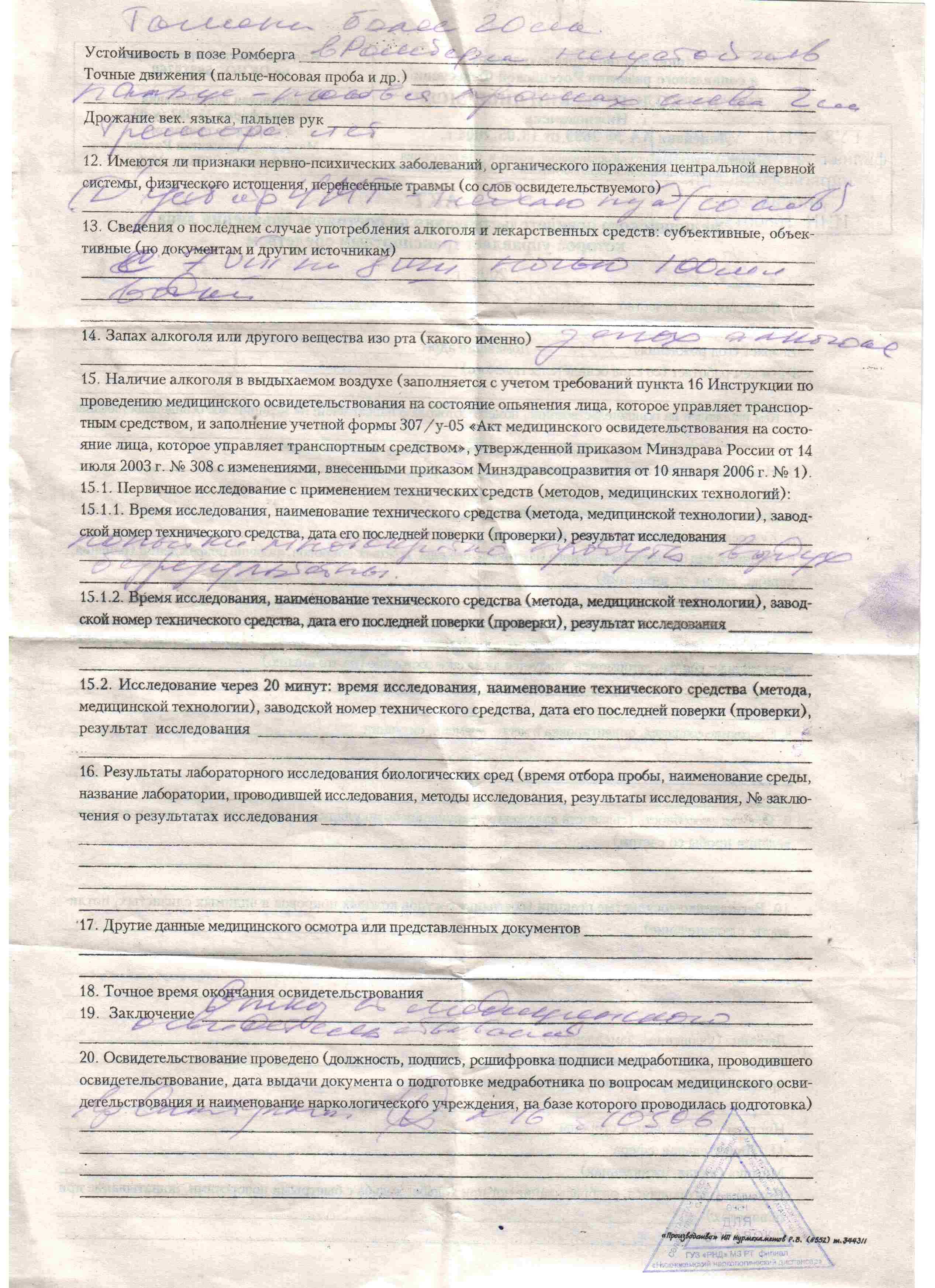 | 15.1.1 Попытки многократно продуть воздух безрезультатны. 19. Отказ от медосвидетельствования 20. врач ФИО непонятно, а дальше номер удостоверения прохождения рбучения наверное.
