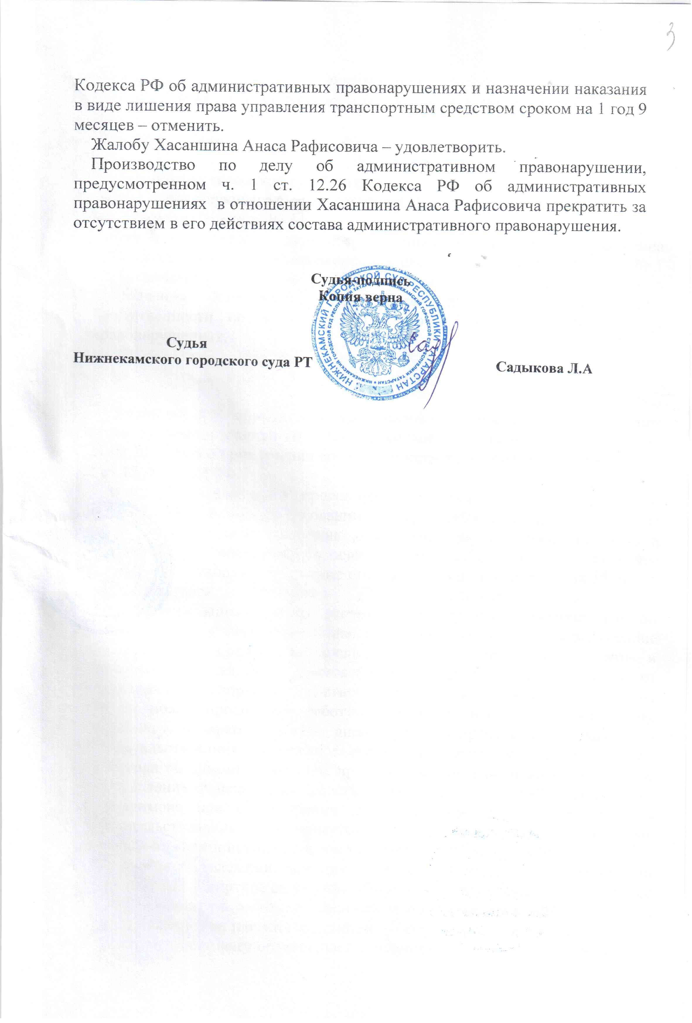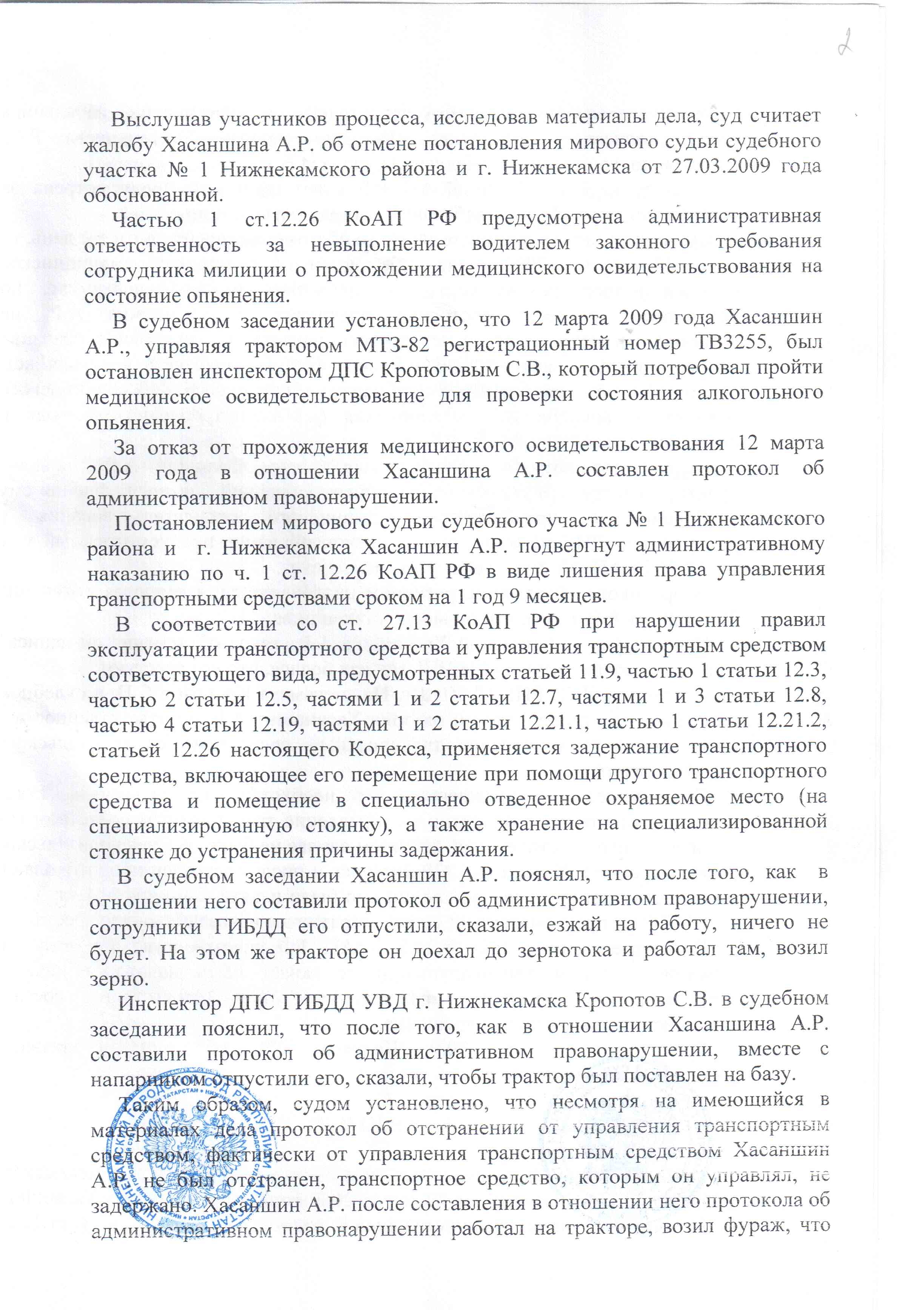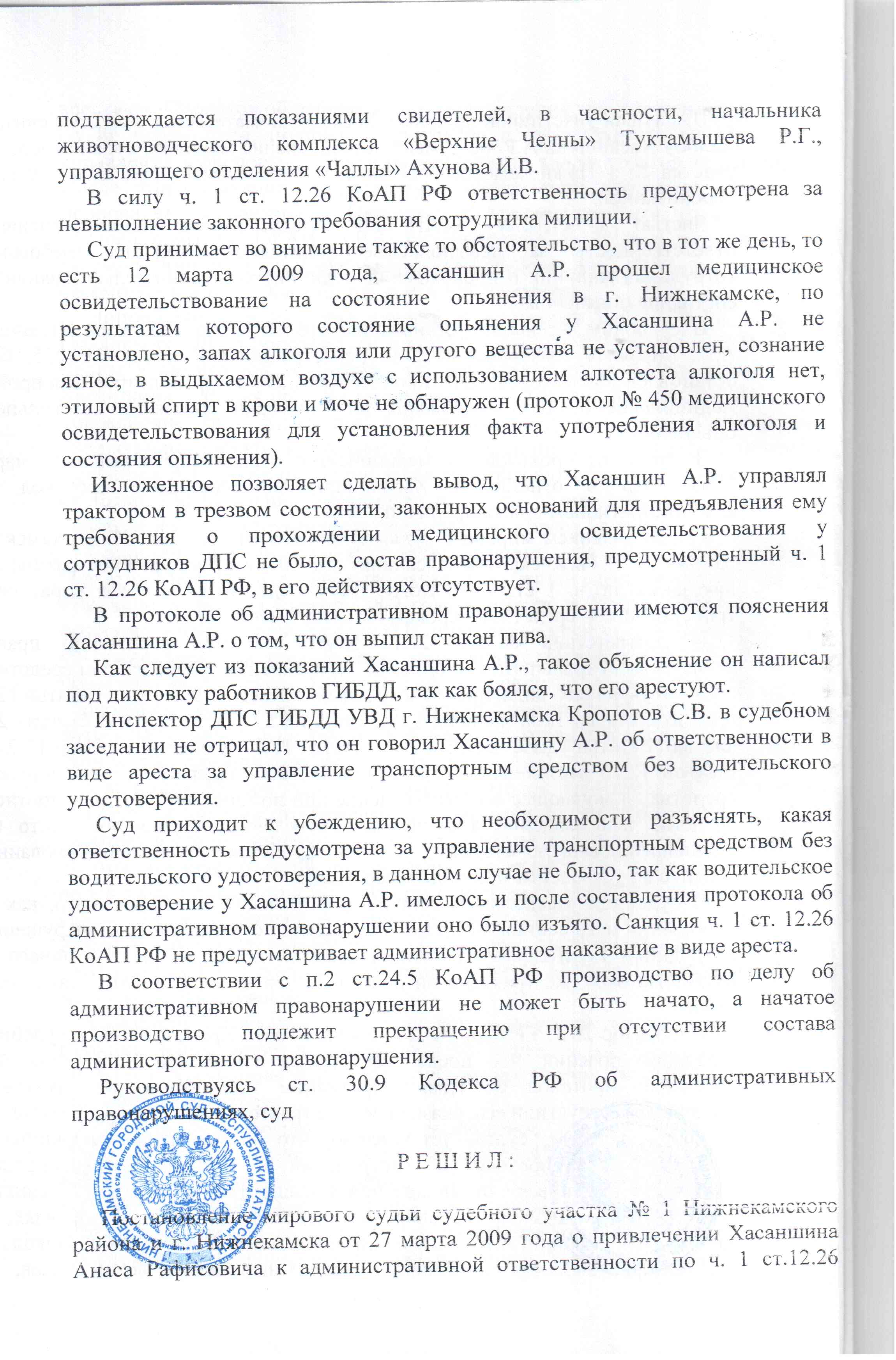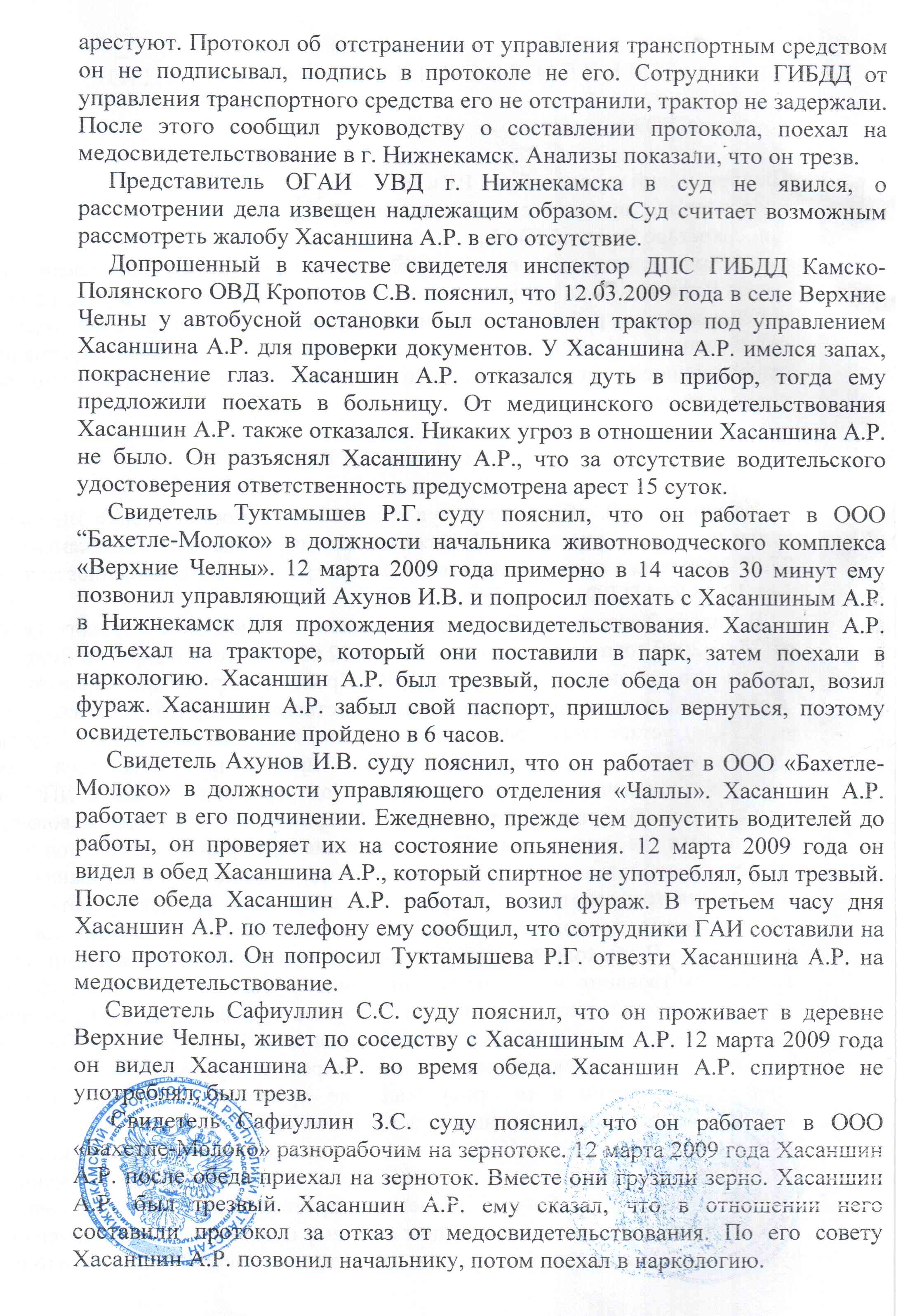 Копии протоколов трактористу не выдавалась. Временное удостоверение не выдавалось. После того, как трактор поставили на базу, Хасаншину сказали ждать, что на обратном пути его заберут и повезут на медосвидетельствование. Для чего везти? ИДПС получили отказ Тракториста. Он самостоятельно съездил в наркологию и прошел освидетельствование. Состояния опьянения не установленно. Ни в крови, ни в моче этанола не обнаружено. Запах алкоголя отсутствует. ИДПСу показало насчет запаха.