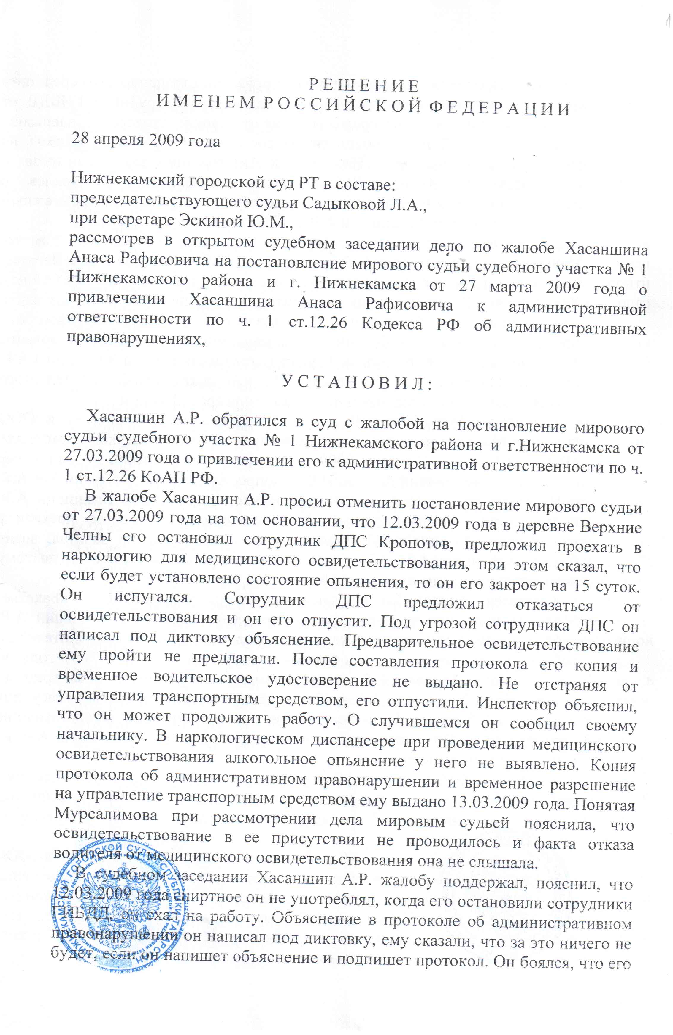 Акт освидетельствования в присутствии понятых не составлялся. Отказа от освидетельствования в акте не зафиксировано. Акт суде не представлялся. При таких обстоятельствах нами ставится под сомнение сама процедура намерения провести освидетельствование на месте.